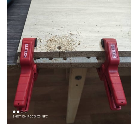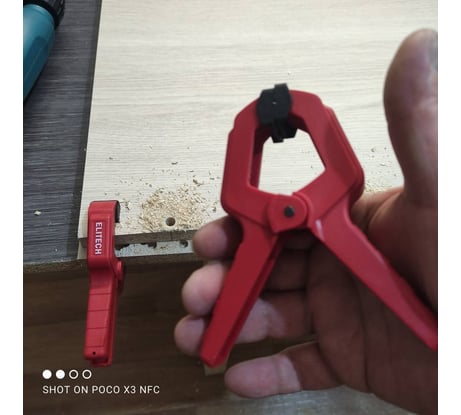 Пружинная пластиковая струбцина ELITECH 512102 ножничного типа с плоскими поворотными губками, с силой зажима 120 Н (12 кг) используется для быстрой фиксации деталей и заготовок.