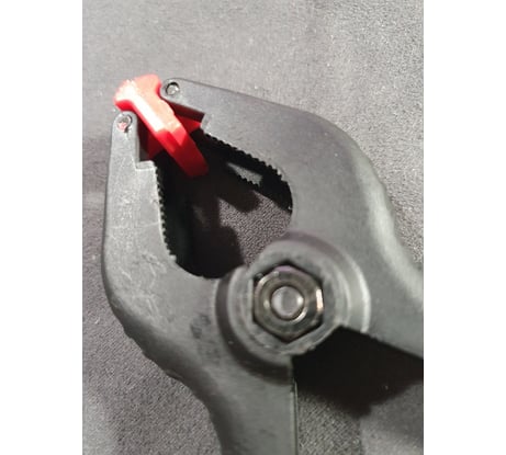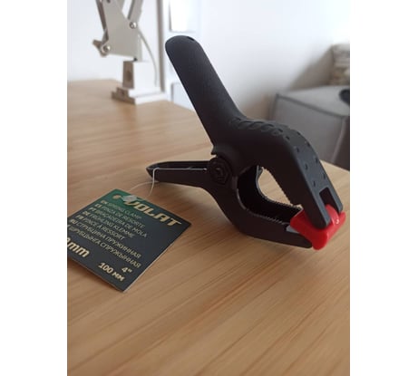 По факту: Пластик не вонючий, но если прогреть в руках, то появляется ненавязчивый запах. Вес экземпляра изделия без этикетки 47гр. Высота 110мм в свободном положении, в сжатом - 117мм. Ширина - 85мм, толщина (ось) - 28мм. Размер губок 22*16мм. Зев раскрывается до 49мм (в моем понимании это есть параметр "рабочий ход"), однако в параллельные плоскости губок максимально можно заправить краем доску толщиной до 42мм, а если вглубь, то только 38мм или зубья надо сточить. В зубастый зев (всего 52 зубчика, четыре раза по тринадцать) можно просунуть и прикусить без выскальзывания, например, трубу диаметром до 34мм. Усилие зажима при разведении губок на 40мм - 8кгс, при разведении на 12мм - 2.8кгс (по опыту работы с разными пружинными струбцинами сила сжатия (упругость пружины) одинаковых экземпляров любого производителя может отличаться чуть ли не на треть - да, так быть не должно, но бывает, проверяйтесь и имейте это в виду). Захват рукой вполне удобный. Эта струбцинка по большому счету хорошая большая зубастая прищепка, которая в большей степени пригодна для прихватывания вязанки проводов, тросов, веревок и т.п., ну и как струбцинка тоже.