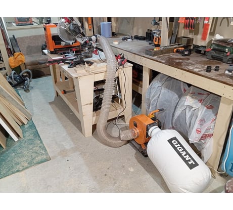 Сетку на выходном пластиковом патрубке пришлось срезать сразу - рейсмусовая стружка забивает её наглухо через минуту. Не понимаю, на что производитель рассчитывал, ставя туда сетку с шагом 10мм. После этого - ОК. "Крест" на входном патрубке видимо тоже придется срезать, т.к. отстыковывать гофру каждые 5 мин - не дело (там стружка набирается через 10 мин работы рейсмуса). Полезный лайфхак: когда переходники к станкам меньше 50мм - в 100-й гофре (подвешенной под потолком на ремнях) начинает понемногу копиться стружка, особенно в поворотах. По окончании работ нужно снять все переходники со станочного конца гофры и при работающем стружкоотсосе потрясти гофру за конец - тогда все накопившееся мухой улетает в мешок.