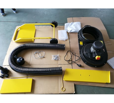 По распаковке все показалось каким-то не надежным, железо тонким, но когда собираешь его то конструкция становится жесткой, дополнительно усиливать ничего не требуется. Можно класть на него небольшие деревяшки, ничего не случится, выдерживает нагрузки. Хорошая сила всасывания, опилки с распиловочного станка убирает.