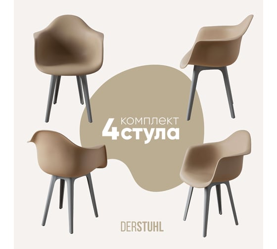 Комплект из 4-х стульев-кресел DERSTUHL, сиденье и ножки выполнены из пластика. Классика дизайна для любого интерьера квартиры, загородного дома, офиса, ресторана, кафе, фудкорта, на веранду, для дачи и сада, для мастера маникюра и клиента. Наши стулья отлично впишутся в такие стили как скандинавский, лофт и минимализм. Стулья произведены в России. Сиденье и ножки стула изготовлены из первичного высокопрочного стеклонаполненного полипропилена. Данный материал устойчив к царапинам и механической деформации, удобен в уходе. Усиленные закладные из полиамида позволяют нашим стульям выдерживать нагрузку до 150 кг. Спинка имеет анатомическую форму, что снижает нагрузку с вашей спины и позволяет комфортно находится на стуле длительное время. Спинка создает эффект качания и амортизации. Под брендом DERSTUHL Вы найдете большой выбор моделей и цветов качественных пластиковых стульев в разных вариациях комплектов: 1 стул, 2 стула в наборе, 4 стула в наборе. Уважаемые покупатели, обращаем внимание, что цвет изделия может незначительно отличаться по тону от представленного на фотографиях в карточке товара. Это связано с индивидуальными настройками и цветопередачей монитора компьютера или телефона, с которого вы просматриваете фотографии товара. Кухонные пластмассовые стулья Eames (Эймс) вы сможете быстро собрать без использования каких-либо специальных инструментов, все необходимое идет в наборе вместе с инструкцией. Сборка стула занимает не более 10 минут.