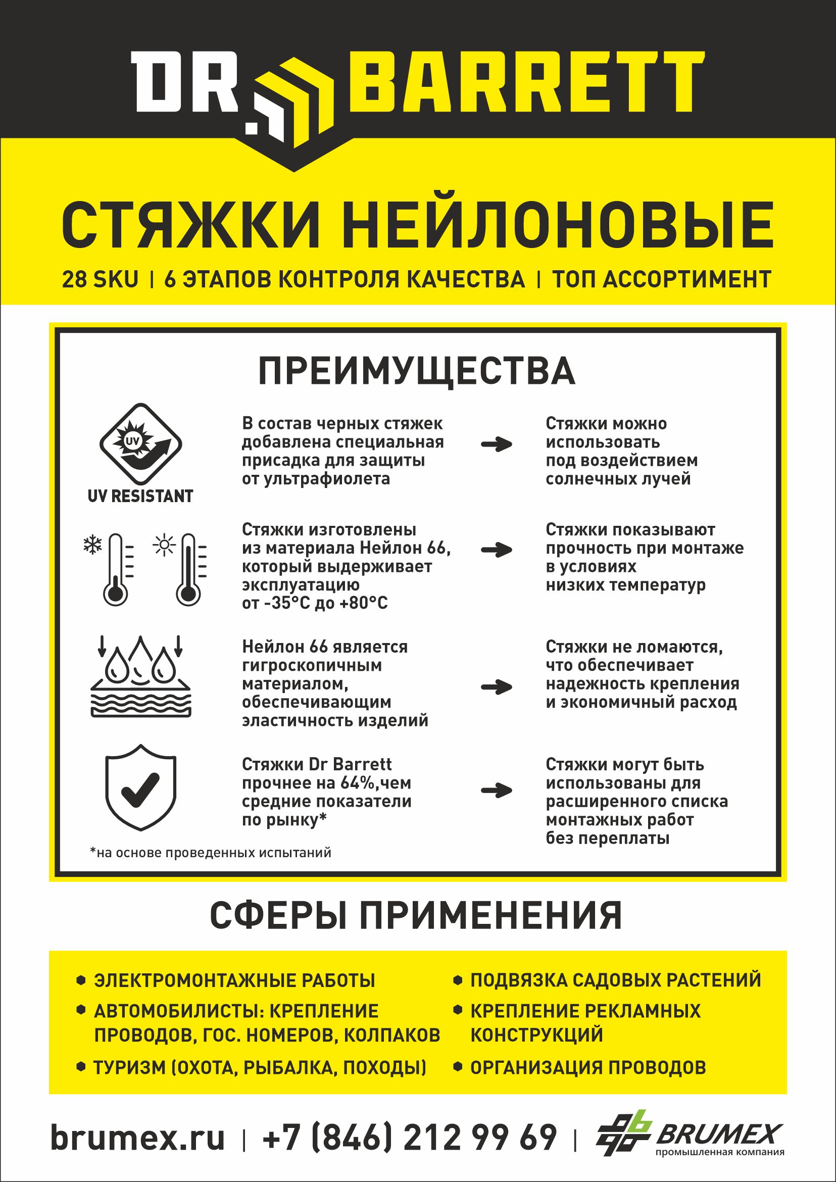 Нейлоновые стяжки — это простое и гениальное решение для быстрой, аккуратной и долговечной фиксации. Идеальный порядок в электрощитах, прокладка коммуникаций, монтаж в автомобиле или надежный крепеж на открытом воздухе — вот лишь несколько областей, где они незаменимы. Стяжки Dr Barrett изготовлены из высококачественного Нейлона 66 и проходят строгий 6-этапный контроль качества, что гарантирует их безупречное исполнение и максимальный срок службы даже в сложных условиях.