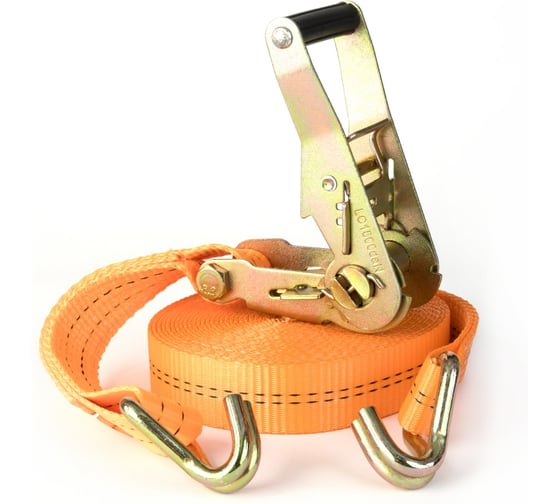 Стяжной ремень применяется для фиксации крупногабаритных грузов во время транспортировки. Изготовлен из прочного материала, рассчитанного на эксплуатацию в любых погодных условиях. Надежный зубчатый механизм предотвращает ослабление натяжения ремня во время движения транспорта. Крюки выполнены из прочной стали.