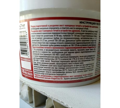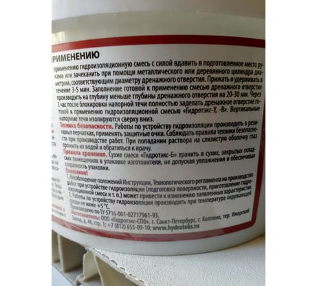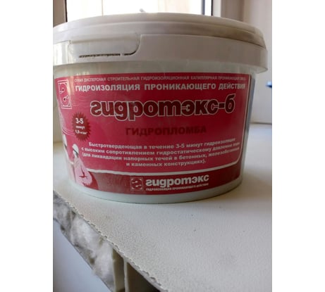 - Для приготовления гидроизоляционной смеси готовой к применению: из упаковки в удобную, предварительно смоченную емкость, высыпать сухую гидроизоляционную смесь ТМ «Гидротэкс-Б», в количестве необходимом для заделки одного подготовленного места напорной течи (примерно 300- 400г. сухой смеси).