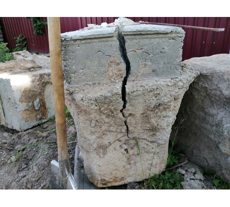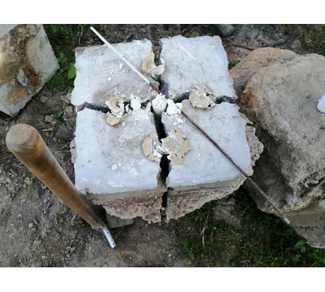 Свою задачу смесь выполнила. Опоры фундамента разрушить удалось. (фото). Разводил смесь точно в соответствие с описанием, но каждый раз оказывалось, что получавшееся залить нельзя, приходилось добавлять воды, чтобы обеспечить хоть какую-то текучесть, при которой смесь можно залить в шпуры. Шпуры делал по минимуму, 32 мм, в соответствие с руководством по применению: "3.5. Шпуры рекомендуется бурить диаметром 32…40 мм (при использовании шпуров диаметром более 40мм возрастает вероятность самопроизвольного выброса материала из шпура)." Иначе расход смеси возрастает очень резко. Обязательно требуется соблюдать технику безопасности, чуть пошевелил кусок треснувшего бетона, он отваливается. Надо издалека ткнуть лопатой, ломом., чтобы управляемо развалить конструкцию, и не допустить самопроизвольного обрушения бетона, например, на ногу. Пока идет процесс разрушения бетона, надо оградить зону работ. Особенно, если есть вероятность, что дети могут подойти к месту работ.