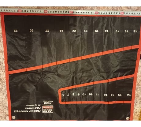 Для самых распространенных ключей, карманы для самых необходимых (13 и 10) дублируются. Размеры 50х58см. Есть крепления, причем металлические, для подвешивания на стену. Есть лямка-липучка для сворачивания сумки. Сумку уже начал наполнять ключами.