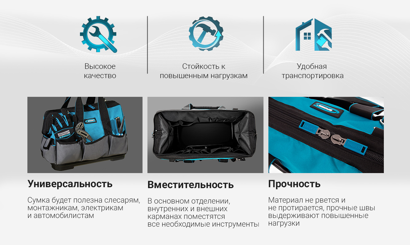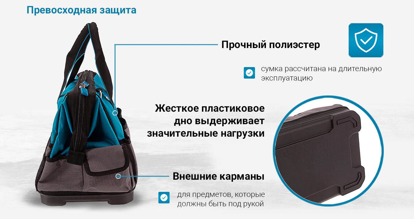 Супер удобные карманы. Чем больше карманов, тем меньше расходуется место непосредственно внутри сумки. Удобные ручки и ремень. У меня влезло абсолютно всё туда: 2 шурика, 3 вида плоскогубцев, трещотки и к ним головки, молоток, набор для пайки с газовым паяльником и еще много чего. Место позволяет) Дно держит, лист металла не стелил. Карманы почти все использую, тупо столько вещей нет чтоб все заполнить. Под дождём не ношу и с сумкой не плаваю. Поэтому у меня не промокает. А вообще мне, видимо, самая четкая сумка попалась среди всех, что гросс продавали)))