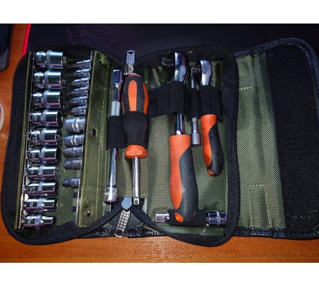 Сумка среднего качества, но удобного форм-фактора. Брал для того, чтобы запихать набор трещеток Ombra 3/8" + 10 головок и Ombra 1/4" + тоже примерно 10головок, и отвертка Ombra под головки. Для установки головок 3/8 купил планку Дело техники на 3/8, и просто оттуда снял железячки и переставил.