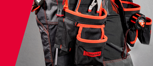 На пояс надеты 2 сумки, между которыми имеется отдельный держатель для молотка, поэтому инструменты можно распределить равномерно. 20 карманов.