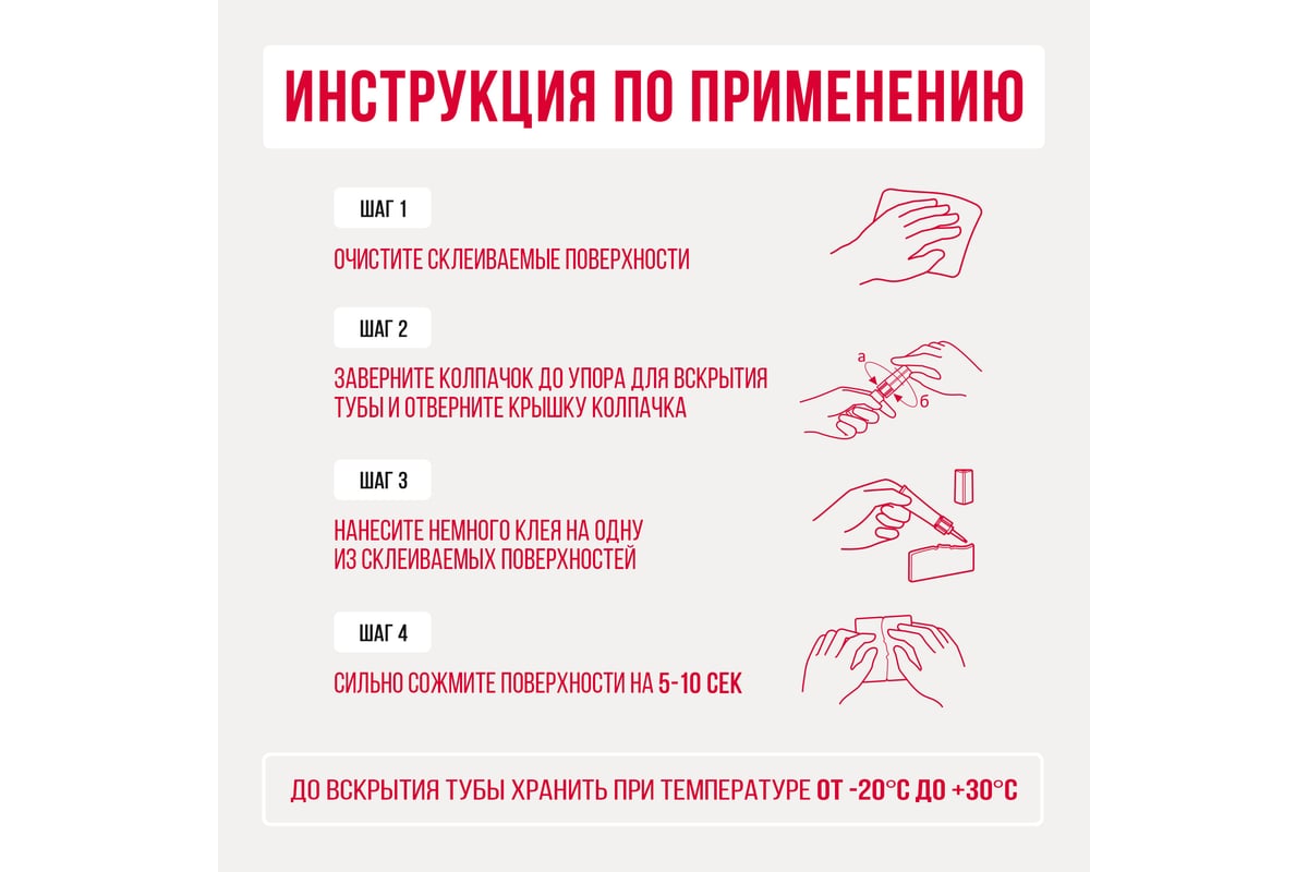 Однокомпонентный моментальный клей на основе этилцианакрилата обеспечивает сверхпрочное соединение материалов за 5-20 секунд с полной фиксацией через 10-15 минут.