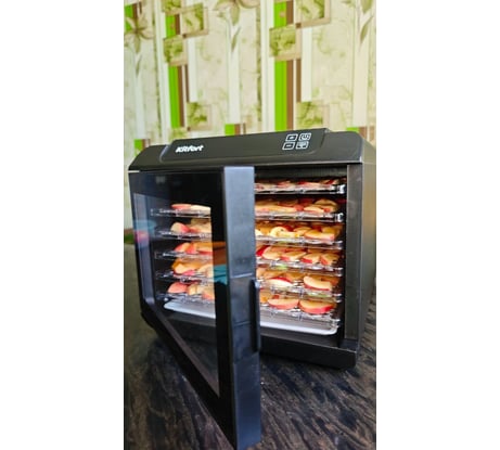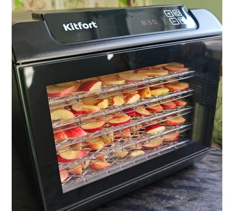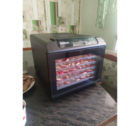 Сушилку посоветовал друг который пользуется ей уже больше года. Стильный дизайн в современном минималистичном стиле отлично вписывается в интерьер кухни. При этом сама сушилка достаточно компактная. В использовании устройство простое и удобное. Управление интуитивно понятное — всё регулируется легко, без лишних кнопок и сложных настроек. Лотки удобно устанавливаются и снимаются, легко моются. Результат сушки отличный: яблоки получаются хрустящими и ароматными. Работает сушилка тихо и равномерно распределяет тепло. Ближе к концу сушки можно перевернуть лотки для досушки самых дальних долек. Отдельно отмечу, что устройство не перегревается даже при длительной работе. Покупкой очень доволен, смело ставлю 5 звёзд и рекомендую всем!