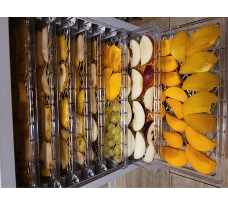 Данную модель купила по рекомендации знакомой. Отличная сушилка. Работает бесшумно. Пока пробовала сушить фрукты. Вмещает в себя достаточно большое количество. По завершении сушки издаёт звуковой сигнал и выключается.