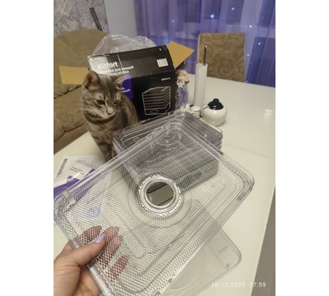 Хорошая и комфортная сушилка. Максимально проста в использовании: достаточно загрузить продукты на решётку и выбрать температуру и время сушки. Очень тихая! Шум совершенно не навязчивый и не заполняет собой всю кухню. Компактные размеры и маленький вес: лёгкая, свободно размещается на холодильнике и не занимает собой всю его поверхность, на фото сравнение размеров сушилки с рукой. Приобретением довольны. Это хорошее решение для тех, кому нужна просто сушилка для своего урожая, без излишеств, и это как раз наш случай)