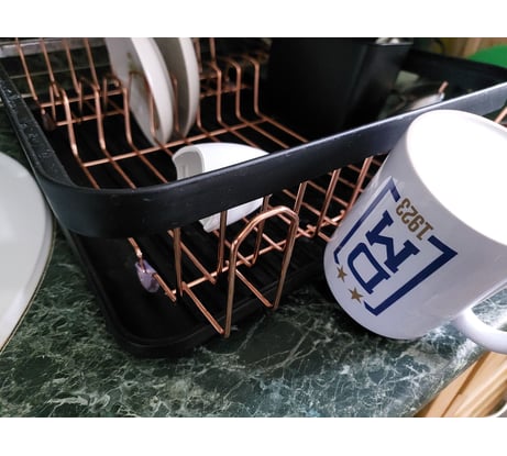 Лоток для ложек и вилок не фиксируется, он просто болтается на ребре под своим весом, крючки для чашек и стаканов выходят за размеры поддона, вода стекает на столешницу, вертикальные рёбра не подходят для больших тарелок, они просто заваливаются, только блюдца нормально вставляются