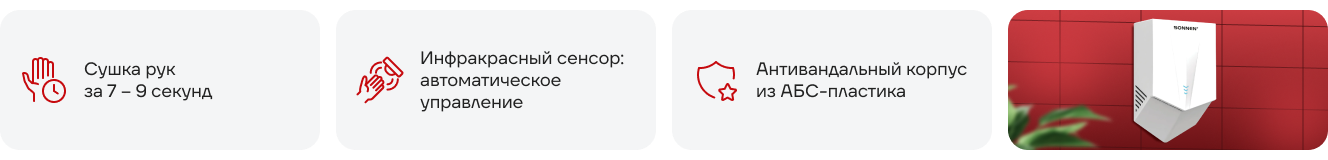 Сушилка SONNEN K2022B отлично справляется со своей задачей. Мощность 1300 Вт и автоматическое включение делают её незаменимой в помещениях с высокой проходимостью. Очень удобно, что время сушки всего 7-9 секунд!