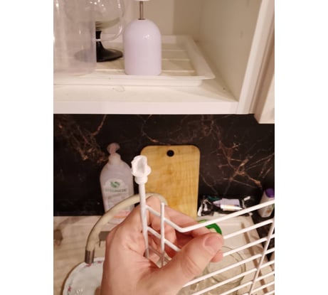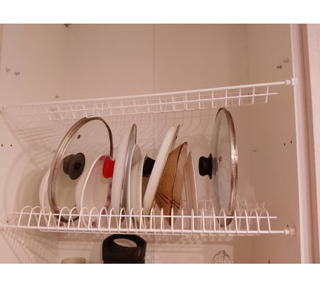 В шкаф 60 см влезла с трудом. После года использования хлипкие пластмассовые крепления не выдержали. Полка с чашками обвалилась. Зачем делать такие ненадежные пластиковые крепления? Почему бы не сделать их из того же прутка, что и саму сушилку, чтобы была единая конструкция? Ещё из-за этих непонятных креплений пришлось высверливать дополнительные отверстия под полкодержатели