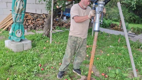 4х тактник. Столбы 60х60 забивает на раз.бака хватает в районе 30 столбов в чернозем,после бура см на 40 ещё углубить. Скорость забивания в районе минуты на эти 40см,но это чернозем.как в других грунтах....