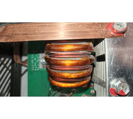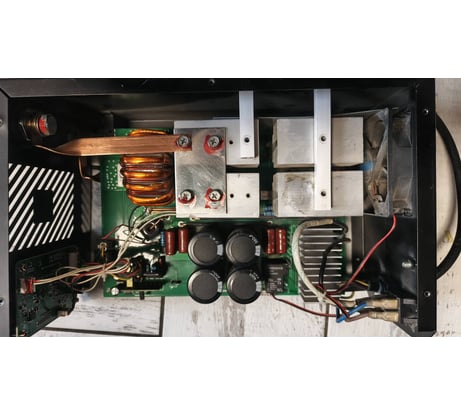 Полномостовая схема с большим запасом надёжности. Сильно разбирать не стал, снимал крышку, чтобы почистить от пыли. Видно 6 силовых транзисторов на двух огромных радиаторах. Четыре конденсатора по 560мф. Два выпрямительных диодных моста с огромными радиаторами и большой трансформатор с чередующимися мягкими и монолитными витками. (На фото видно). Выходной дроссель 4,5Гн - маловат для такого аппарата, но справляется со своей работой. Я им пользуюсь уже три года. УОНИ без проблем варит с отрывом. Нормально воспринимает длинные кабели, длинные удлинители и работает от сильно просаженной сети. Ручка энкодера сломалась. Она пластиковая, живёт недолго. Заменил полностью запчасть на стальную, теперь ей сносу нет. Аппарат по внутреннему устройству 1:1 - decapower ease arc 200, но фоксвелд даёт гарантию больше и заявленный ПА 100%. Ни разу я не использовал его на всю мощность. Очень любит хорошую массу! Если контакт плохой, вы заметите, что он варит не так, как обычно. Проверяйте все соединения кабелей и контакт массы.