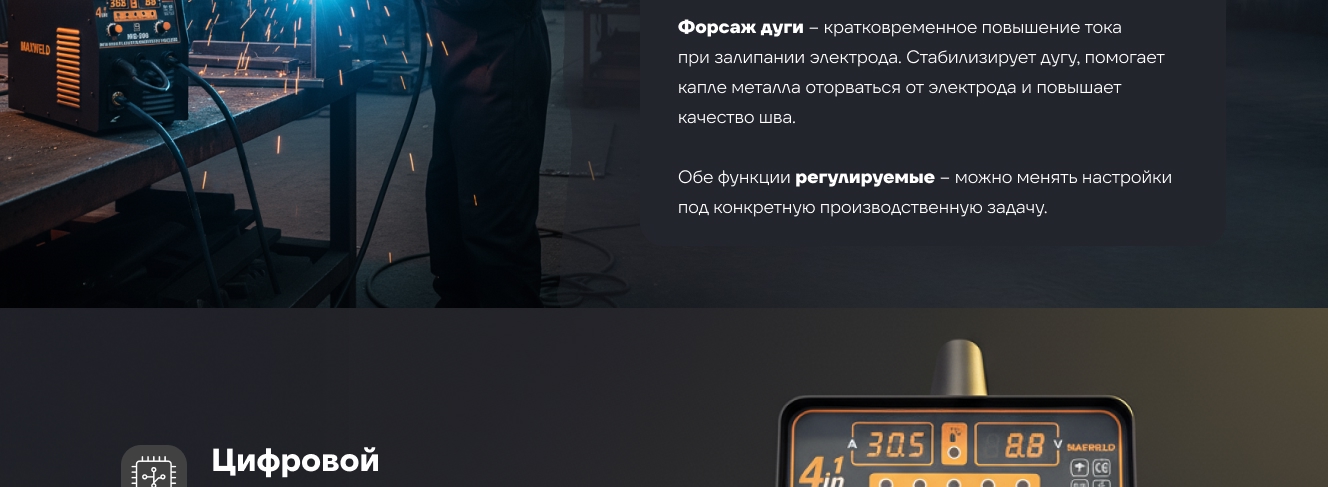 Инвертор MAXWELDMIG/MAG-200 идеален для сварки легированных и нелегированных сталей, нержавеющих сталей и чугуна. Настройки форсирования дуги и горячего старта регулируются и помогают сварщику точно задать характеристики, соответствующие конкретной производственной задаче. Цифровой микропроцессор служит для точного управления всеми функциями и обеспечивает лучшие в своем классе показатели сварки во всем диапазоне тока аппарата. АппаратMAXWELDможно использовать с электродами диаметром до 4,0 мм.