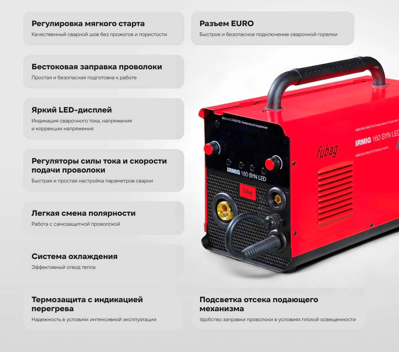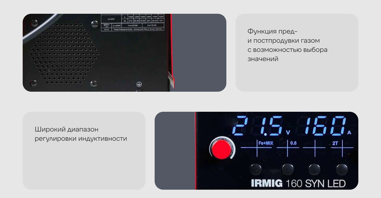 Передняя панель оснащена LED-дисплеем, регуляторами силы тока и скорости подачи проволоки, что позволяет быстро и просто выбирать режимы и оптимальные параметры сварки. Оснащен евроразъемом (Euro) для быстрого и безопасного подключения сварочной горелки. Купив сварочный инвертор IRMIG 160 SYN LED, вы получите в коробке фирменную горелку Fubag 150 А и газовый шланг, а также кабель с электрододержателем и кабель заземления. Продолжительность включения (ПВ) составляет 20% при 40°С (в соответствии с европейским стандартом EN60974-1). Сварочный полуавтомат Fubag IRMIG 160 SYN LED обладает легкой сменой полярности для работы с самозащитной проволокой. Эффективная система охлаждения, а также встроенная функция термозащиты с индикацией перегрева гарантируют долговечность и надежность использования аппарата в условиях интенсивной эксплуатации. Все технические характеристики наглядно и подробно указаны на корпусе аппарата.