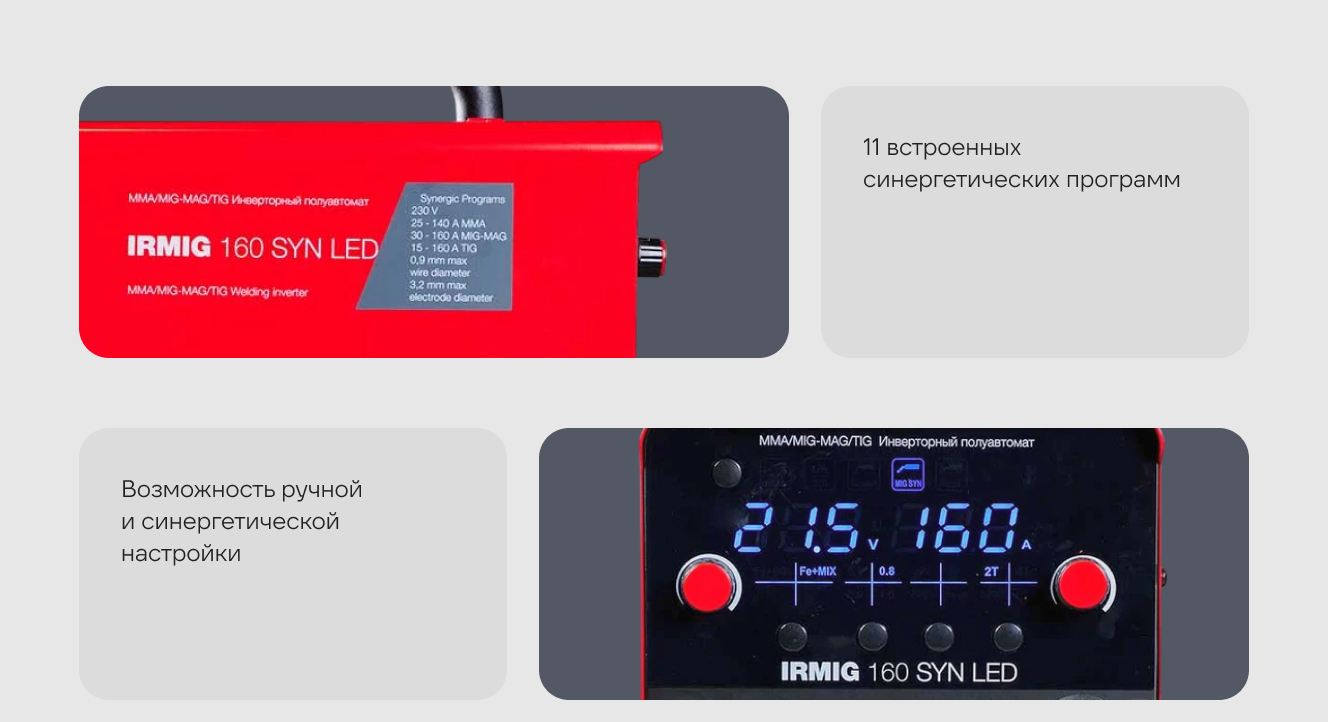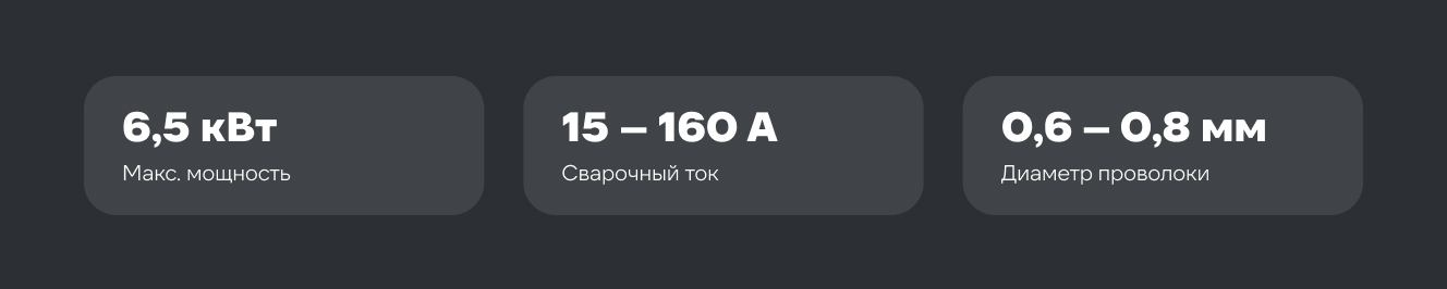 Оснащен ярким, хорошо читаемым LED дисплеем с индикацией сварочного тока, напряжения и коррекции напряжения. Аппарат работает в распространенном диапазоне сварочного тока 15-160 А с проволокой диаметром от 0,6 до 1 мм, катушкой весом 5 кг и диаметром 200 мм.