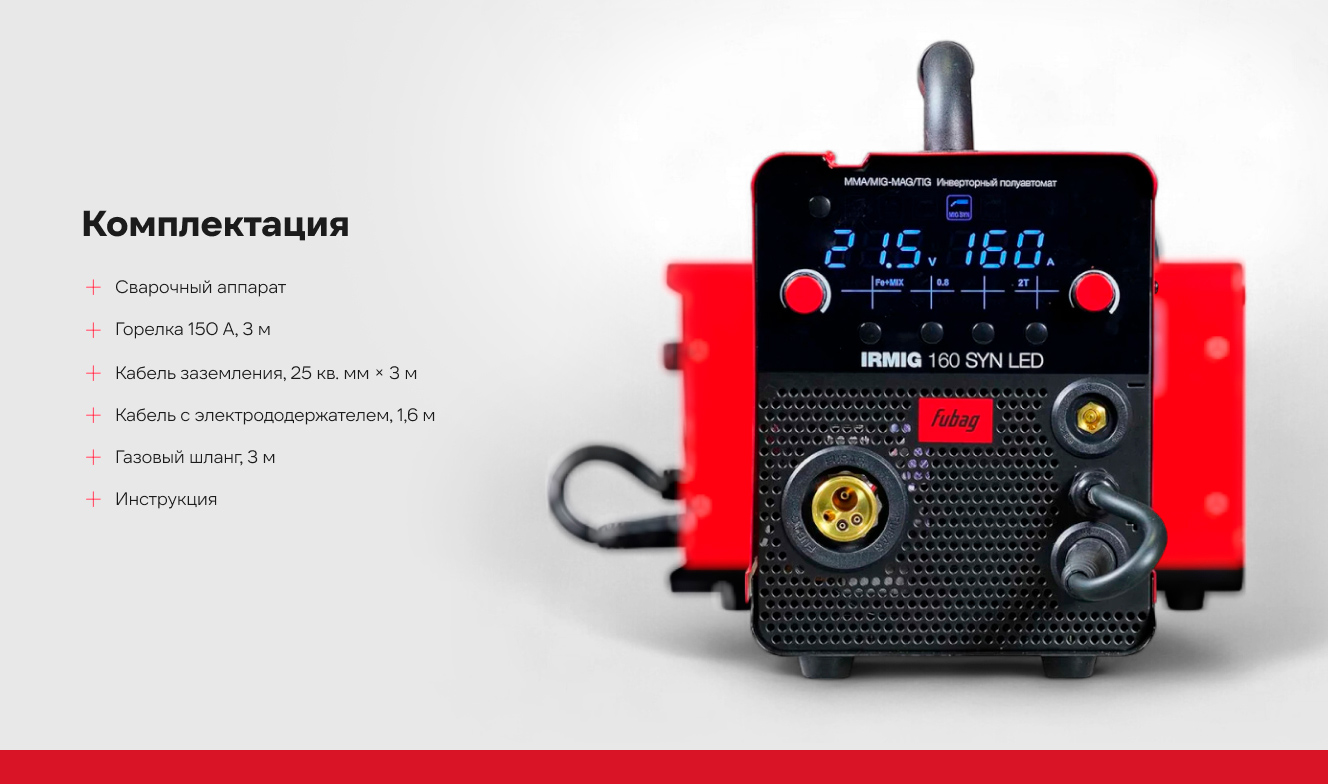 Сварочный полуавтомат Fubag IRMIG 160 SYN LED – высокопроизводительный инверторный аппарат с ярким LED-дисплеем. Выбор методов сварки MMA, MIG/MAG, TIG Lift. Имеет 11 встроенных синергетических программ.