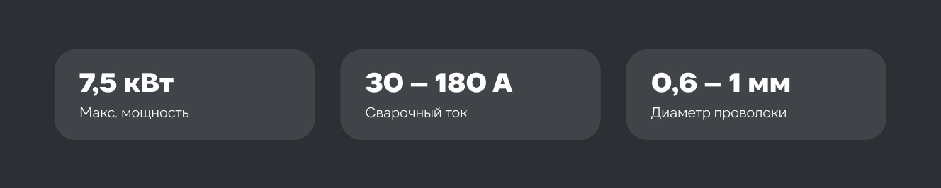 Оснащен ярким, хорошо читаемым LED дисплеем с индикацией сварочного тока, напряжения и коррекции напряжения. Аппарат работает в самом распространенном диапазоне сварочного тока 15-200 А с проволокой диаметром от 0,6 до 1,0 мм, катушкой весом 5 кг и диаметром 200 мм.