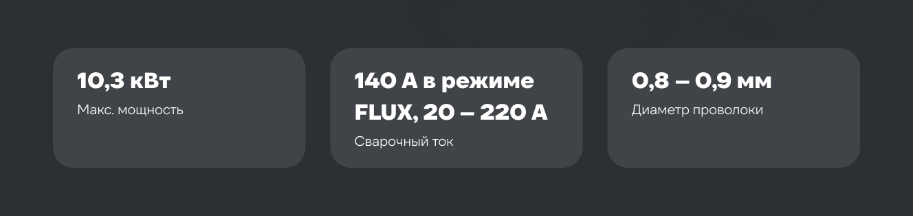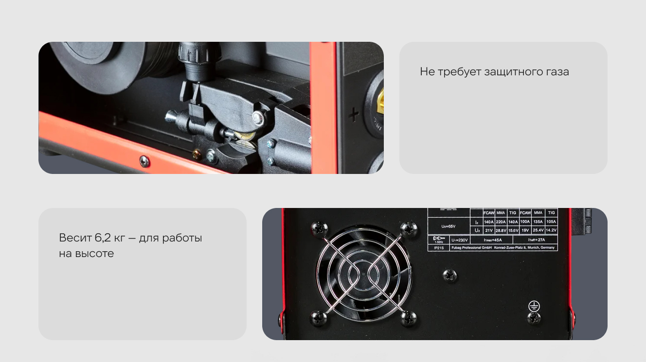Компактный сварочный аппарат для сварки флюсовой проволокой без газа, MMA и TIG lift. Надежный металлический корпус. Легкий (6,2 кг) и удобный в использовании. Не требует защитного газа. Применяется для сварки стали небольших толщин на открытом воздухе и в помещениях.