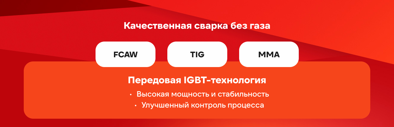 Основной способ сварки - полуавтоматическая сварка порошковой проволокой без использования защитного газа, режим FCAW (Flux). Данным способом возможно производить сварку и наплавку, большинства углеродистых сталей, сплавов на основе никеля, чугуна и некоторых нержавеющих сталей, начиная от 0.5 мм, и прочих металлов от 1 мм. Максимальный вес катушки с проволокой, устанавливаемой на аппарат - 1 кг.