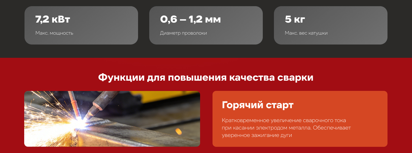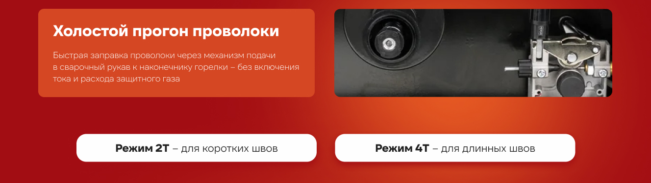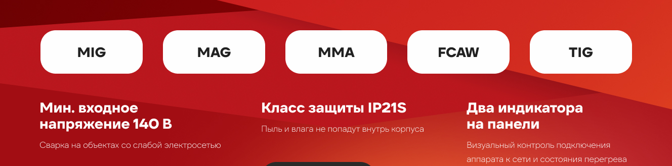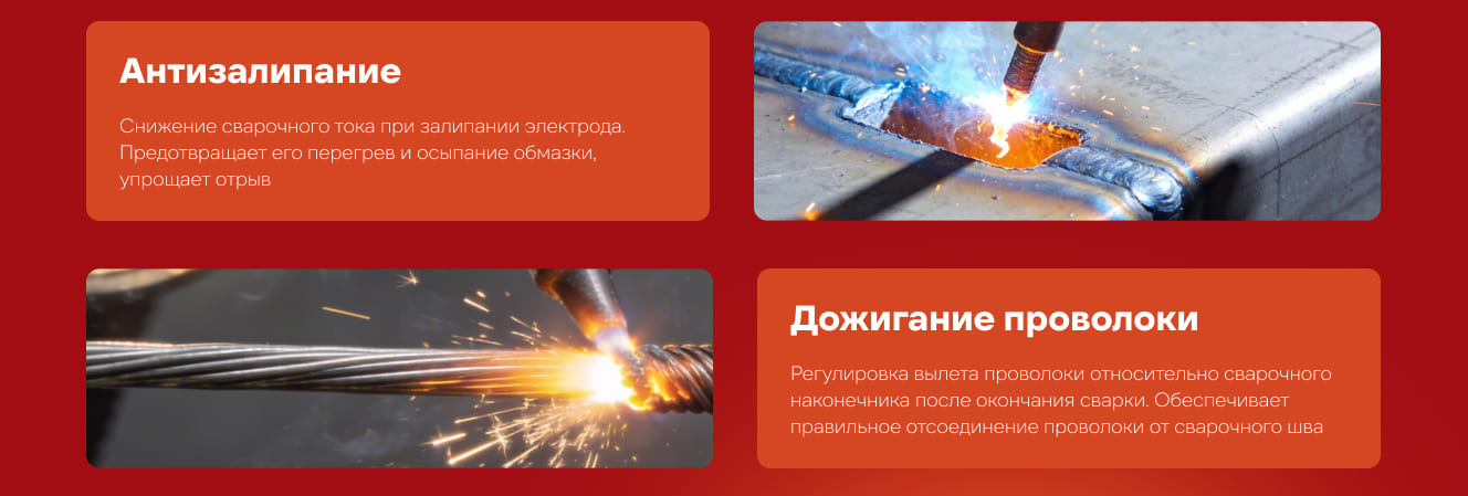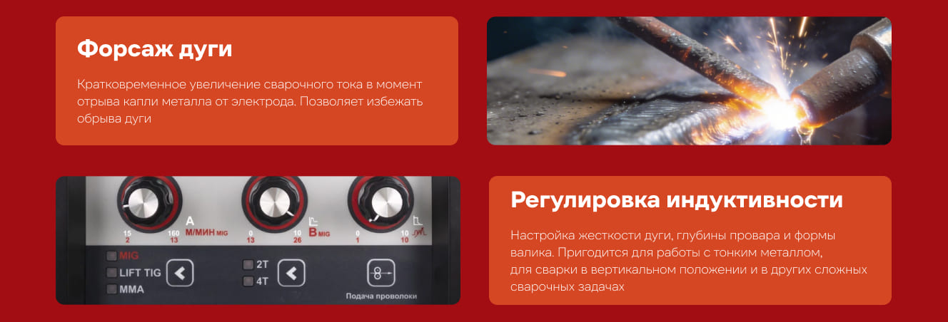 - Полуавтоматическая сварка постоянным током проволокой в среде защитного газа углеродистых и нержавеющих сталей (режим MIG/MAG). Сварка осуществляется постоянным током в среде инертных (MIG) или активных (MAG) защитных газах