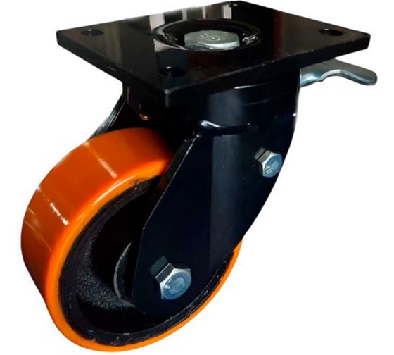 Полиуретан отличается высокой износостойкостью и устойчивостью к маслам и механическим повреждениям, что повышает срок службы изделия в условиях интенсивной эксплуатации. Основное преимущество модели — поворотный стальной кронштейн с надежным тормозом, который позволяет легко маневрировать в ограниченных пространствах и надежно фиксировать колесо при остановке. Такая конструкция обеспечивает точный контроль движения и безопасность оператора. Шариковый подшипник снижает сопротивление качению, обеспечивая легкость вращения даже под большими нагрузками.