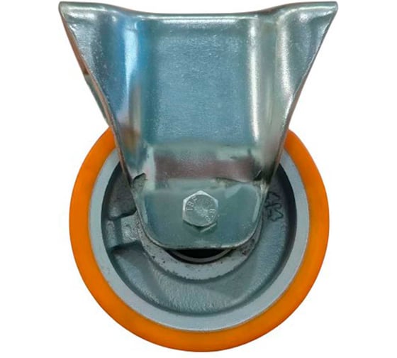 Неповоротный стальной кронштейн с площадкой фиксирует колесо в одном направлении, обеспечивая стабильность и прямолинейное движение платформ и тележек. Шариковый подшипник снижает сопротивление качению, облегчая вращение колеса под нагрузкой и работу оператора.