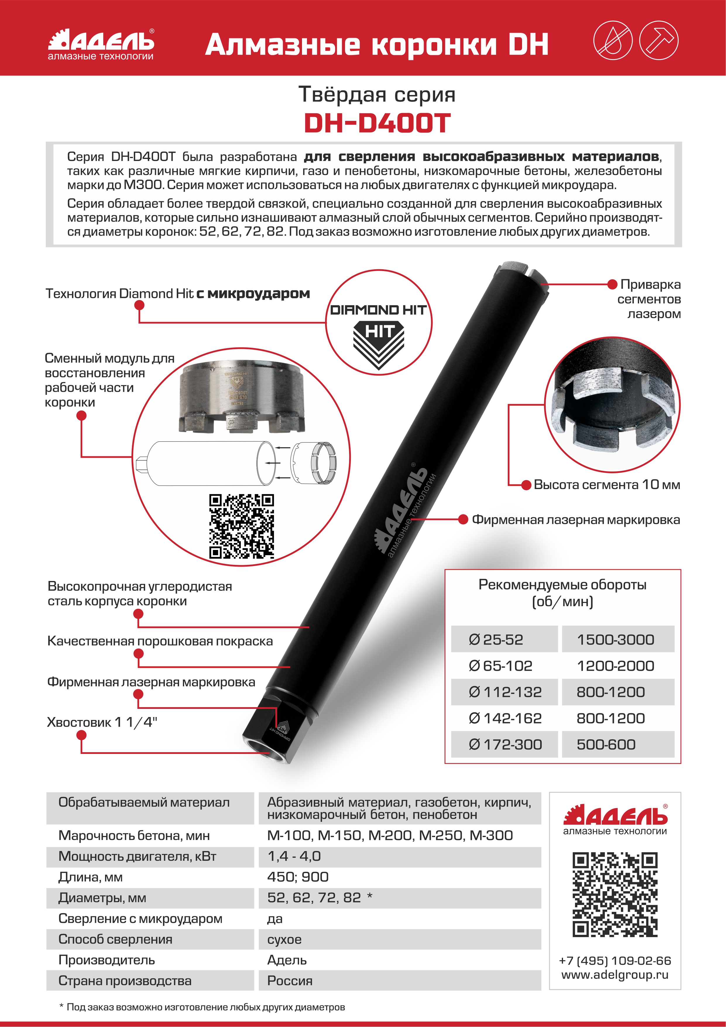 Вопросы и ответы об алмазном сверле Адель DH-D400T 52х450 мм; 1 1/4; 5 сегментов ДУУ00007709