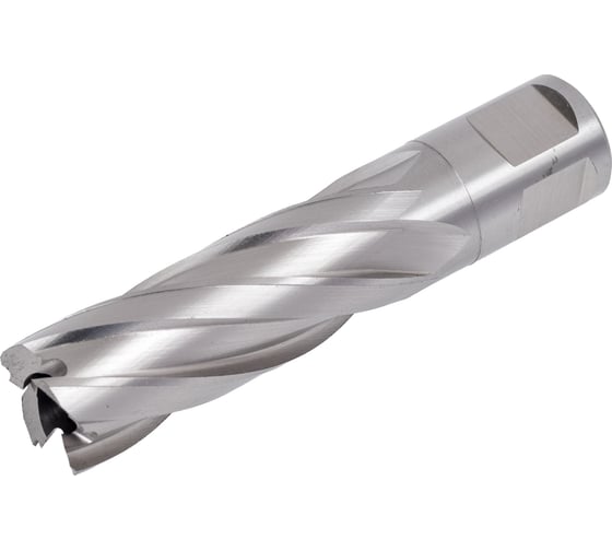 Сверло оснащено хвостовиком Weldon и имеет сквозное отверстие под направляющий штифт (пилот), центрирующий и выталкивающий керн (кусок металла, остающийся в полости сверла после работы над отверстием).