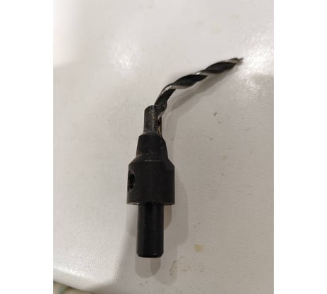 В плохой адаптер для конфирмата, рассчитанный на сверло 5 мм засунули обычное сверло по металлу 4,5 мм. В итоге сверло встаёт со смещением, дерево сверлит плохо (рвет и задирает). А адаптер плохой, потому что у него внутренний диаметр 5,5 мм - то есть даже штатное сверло в 5 мм в него встанет со смещением.