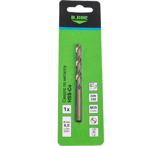 Сверло по металлу COBALT 5%, HSS-Co, DIN 338 6х57х93 мм D.BOR D-TD-338-CO5-060-01