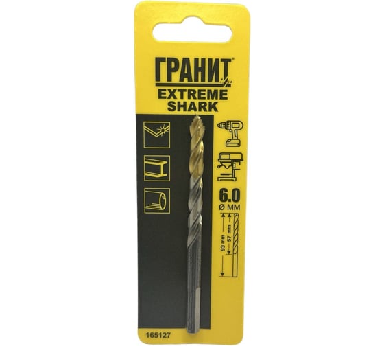 Сверло по металлу спиральное 6,0х93/57 мм ГРАНИТ EXTREME SHARK 165127 предназначено для сверления отверстий в конструкционных углеродистых и легированных сталях, нержавеющих и жаростойких сталях прочностью до 1000 N/mm2, титана и его сплавов, бронзы, латуни, цветных металлах, чугуне, твердом пластике.
