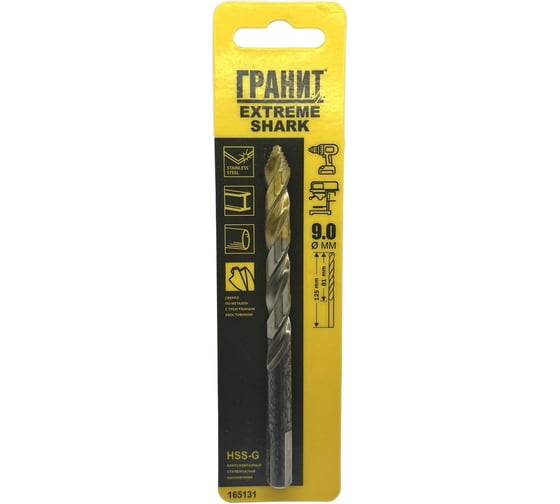 Сверло по металлу спиральное 9х125/81 мм ГРАНИТ EXTREME SHARK 165131 предназначено для сверления отверстий в конструкционных углеродистых и легированных сталях, нержавеющих и жаростойких сталях прочностью до 1000 N/mm2, титана и его сплавов, бронзы, латуни, цветных металлах, чугуне, твердом пластике.