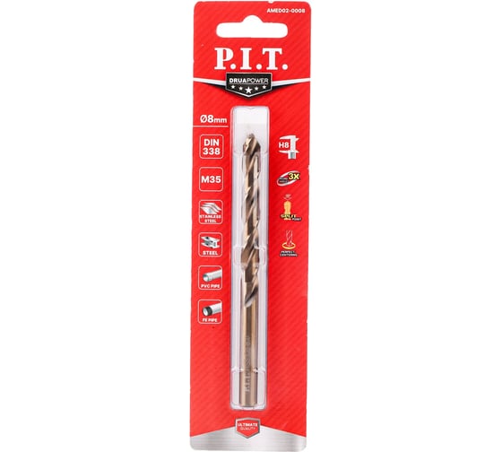 Сверло по металлу кобальтовое с титановым покрытием P.I.T. 8.0x117 мм М35 Co5% 135° AMED02-0008