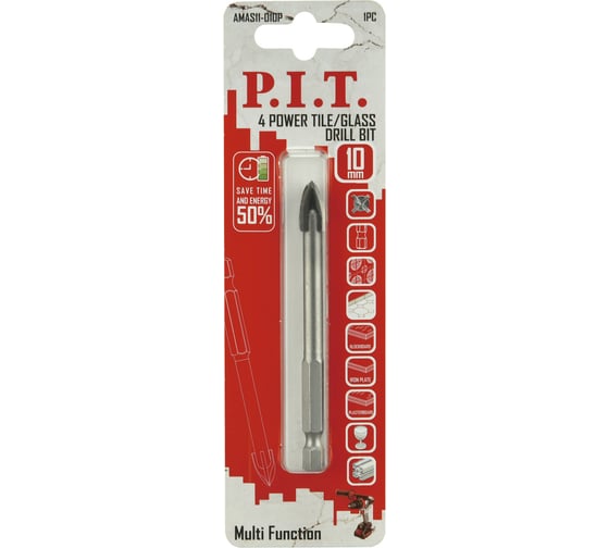 Сверло по стеклу и керамике P.I.T. 10x90 мм 4 режущие кромки хвостовик HEX 1/4 (6.35 мм) AMAS11-010P