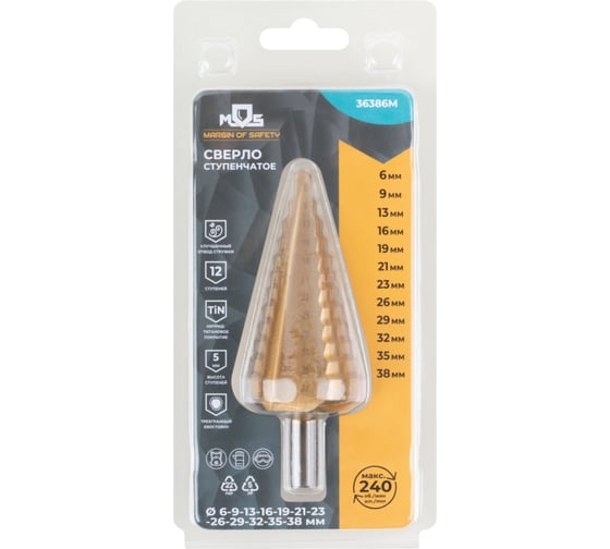 Сверло ступенчатое MOS HSS по металлу, 12 ступеней 6-9-13-16-19-21-23-26-29-32-35-38 мм 36386М