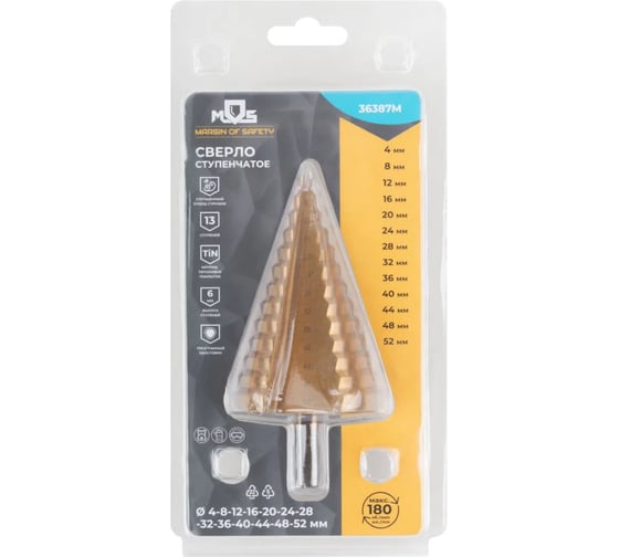 Сверло ступенчатое MOS HSS по металлу, 13 ступеней 4-8-12-16-20-24-28-32-36-40-44-48-52 мм 36387М