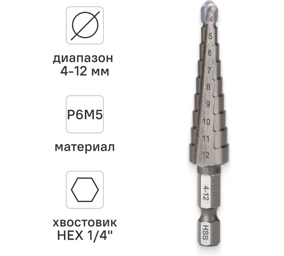 Сверло ступенчатое предназначено для эффективного сверлениятонколистового металла и цветных металлов, твёрдого пластика, древесины без деформаций. Сверло выполнено из высококачественной быстрорежущей легированной стали M2 (Р6М5) твердостью 63-65HRC, которое увеличивает износостойкость инструмента. Надежную фиксацию сверла в патроне инструмента обеспечивает шестигранный хвостовик 1/4" HEX который позволяет устанавливать его не только в электроинструмент с быстрозажимным патроном, но и с патронами типа НЕХ. Благодаря плавному ступенчатому переходу, сверло позволяет выполнять различные по диаметру отверстия (от 4 до 12 мм), не меняя каждый раз оснастку. А также применяется для расширения уже существующих отверстий.