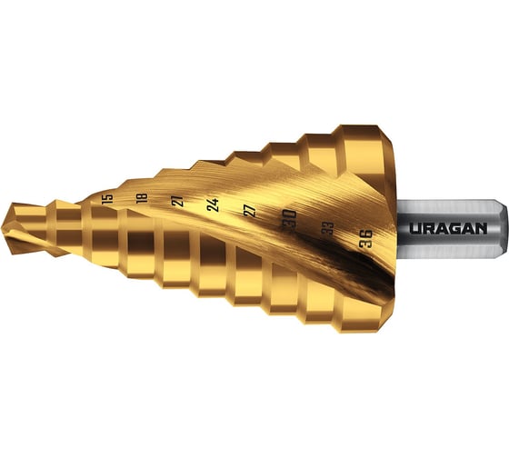 Сверло ступенчатое Uragan 9-36мм, 10 ступеней, винтовая спираль 29658-9-36-10