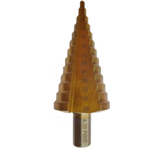 Сверло ступенчатое (4-39 мм; шаг 3 мм) изготовлено из высококачественной быстрорежущей стали Р6М5 и предназначено для получения отверстий в листовых металлических и пластиковых материалах. Покрытие нитридом титана значительно увеличивает сопротивление перегреву во время сверления исрок службы сверла. Рекомендуется работать с использованием смазочно-охлаждающих жидкостей. Диаметр сверления 4-39 мм, шаг 3мм.