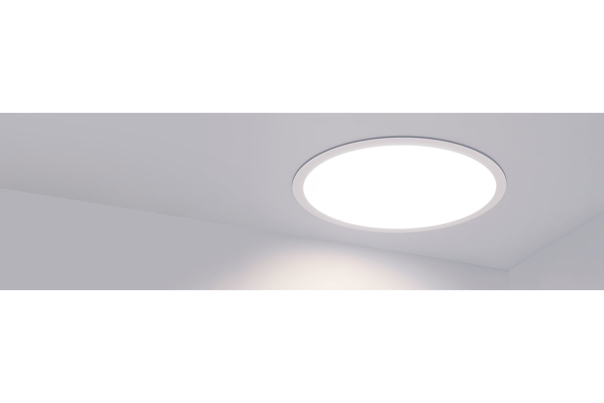 Светильник Arlight DL-EDGE-R500-40W Warm3000 036421 с драйвером 33-40 В, 1000 мА, пульсация <1%. Световой поток 3200 лм, 80 лм/Вт, теплый 3000 K, CRI>80, угол 115°, напряжение питания 230 В. Белый круглый корпус из алюминия, экран PMMA+PS, степень защиты IP40. Размер: диаметр 500 мм, высота 15 мм. Монтаж встраиваемый, установочное отверстие: диаметр 480 мм.