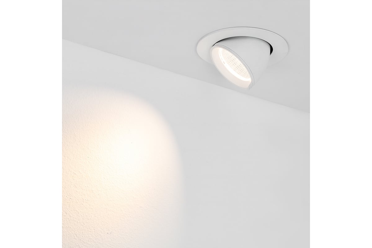 Светильник Arlight LTD-EXPLORER-R100-12W Warm3000 024026 поворотно-выдвижной. Мощность 12 Вт, св. поток 890 лм, 74 лм/Вт, теплый 3000 K, CRI>90, угол 38°. Белый круглый корпус из алюминия, экран стекло, степень защиты IP20. Угол поворота 350°, угол наклона 45°. Размер: диаметр 99 мм, высота 85 мм. Монтаж встраиваемый, установочное отверстие: диаметр 90 мм. Драйвер 20-40 В, 300 мА, пульсация <3%.