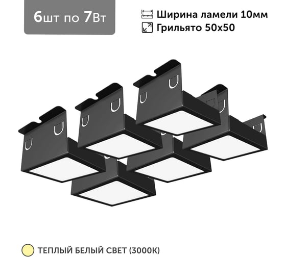 Светильник для грильято Geniled 6шт по 7Вт 3000К для ячейки 50x50 мм ширина ламели 10 черный встраиваемый 27098_3000_black