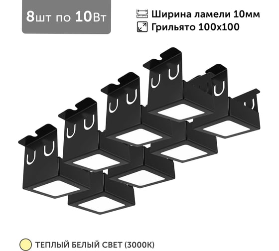 Светильник для грильято Geniled 8шт по 10Вт 3000К для ячейки 100x100 мм ширина ламели 10 черный встраиваемый 27192_3000_black