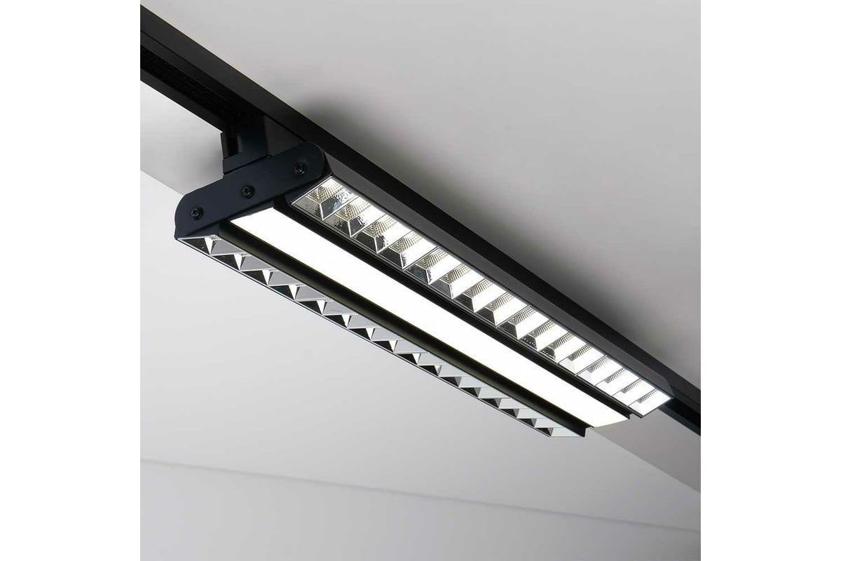 - Конструкция трековой системы обеспечивает перемещение прожекторов вдоль трека, что позволяет изменять направление света и уровень освещенности различных зон.